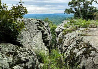 As you continue your hike, you’ll go down toward the base of the bluffs. Enjoy these bluffs. There are little cave shelters, nooks, and crannies to explore. Be careful during the warmer months, as timber rattlesnakes and copperhead snakes occur in this area. I’ve seen quite a few rattlesnakes in Garden of the Gods Wilderness. Do note that it is unlawful to harm a snake on federal National Forest land. There are many rock formations and amazing bluffs to take pictures of at the base.